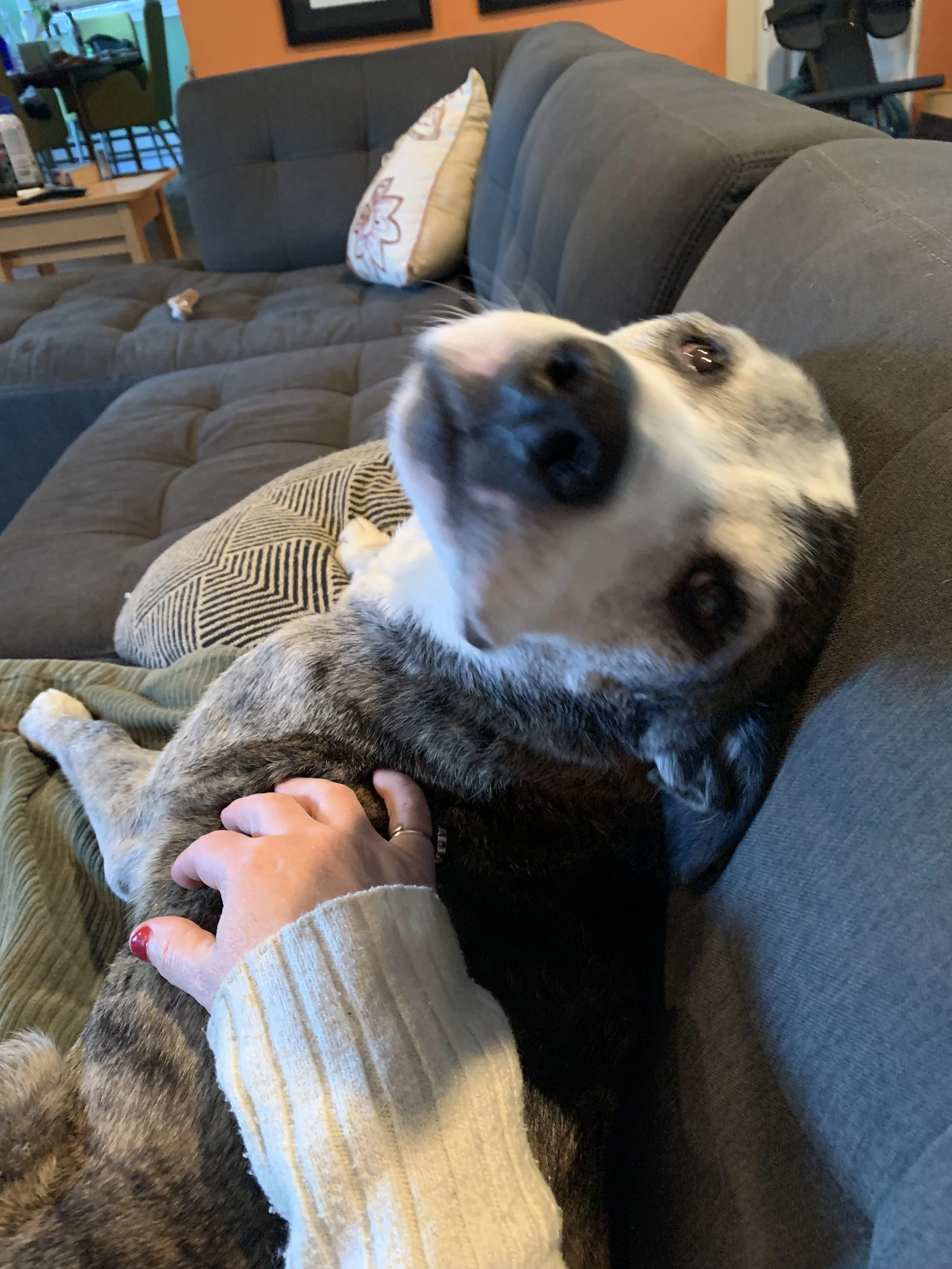Fat tears fall and my dog, Humphrey, lying next to me, lifts his head, checking on me. He doesn't rest until I look him in the face, pet his sleek head.